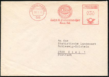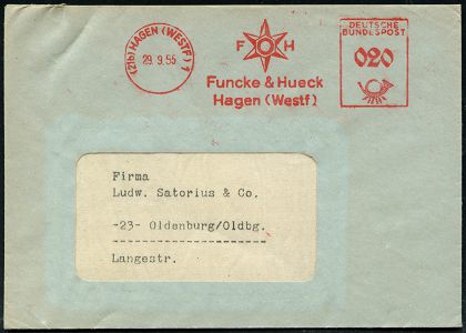 10735 | 15 € | 5800 HAGEN : (21b) HAGEN (WESTF) 1/ F H/ Funcke & Hueck.. 1955 (29.9.) AFS Francotyp "Posthorn" (Stern-Logo) , klar gest. Fern-Bf. (Dü.E-23 B Ao = alte B-Maschine!) | ![]() | |