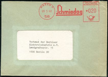 10738 | 18 € | 5800 HAGEN : 58 HAGEN 1/ Schmiedag 1962 (28.5.) AFS Francotyp mit kleine 1K-Ortsstempel mit kleiner PLZ , rs. Abs.-Vordruck, Fern-Bf., vergl. Kat.-Nr. 10711 (Dü.E-23DO = Sondertype!) | ![]() ![]() | |