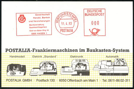 10742 | 18 € | 5800 HAGEN : 5800 Hagen 1 1983 (11.4.) AFS.: VORFÜHRSTEMPEL/POSTALIA/Gewerkschaft/Handel, Banken u. Versicherungen.. (Logo) seltene Postalia-Musterkarte!, selten! (= Specimen) | ![]() | |