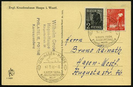10661 | 18 € | 5800 HAGEN : (21b) HAGEN-HASPE/ 1.GROSSE./ ..RAMMLERSCHAU/ WESTF./ KANINCHENZÜCHTER 1948 (16.2.) SSt = Kaninchen klar auf Color-Foto-Ak.: Isolierhaus Evgl. Krankenhaus Haspe, portorichtige Orts-Kt. (Bo.12) | ![]() ![]() | |