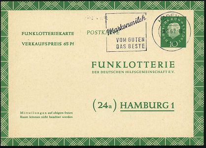 10665 | 16 € | 5800 HAGEN : 58 HAGEN 1/ sc/ Markenmilch/ VOM GUTEN/ DAS BESTE 1962 (8.6.) MWSt auf Funklotterie-FP 10 Pf. Heuss III (Mi. FP 7) seltene Verwendung! (Bo.20 A II, nur 1962 verwendet!) | ![]() ![]() | |