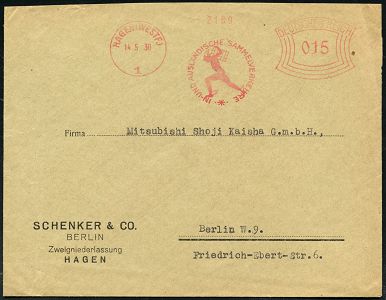 10671 | 18 € | 5800 HAGEN : HAGEN (WESTF.)/ 1/ IN-U.AUSLÄNDISCHE SAMMELVERKEHRE 1930 (14.5.) AFS Francotyp "Bogenrechteck" = geflügelter Merkur (mit Kiste) klar gest. Firmen-Bf.: SCHENKER & CO.. (rs. Klappenausriß) n. Berlin (Dü.E-1CEh) | ![]() | |