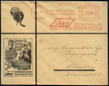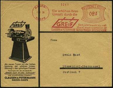 10686 | 25 € | 5800 HAGEN : HAGEN-/ HASPE/ ..GREIF/ ..CLAUSSEN & PETERMANN SCHLEIFMASCH.-SPEZIALFABRIK 1936 (1.8.) AFS Francotyp "Bogenrechteck" auf dekorativem Reklame-Bf.: Greif-(Elektro)-Schleifmaschine (auf Sockel), dekorativer Fernbf. (Dü.E-1CEh) | ![]() | |