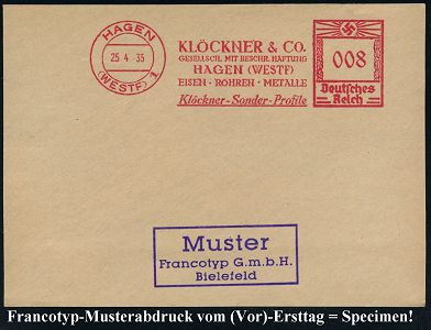 10681 | 35 € | 5800 HAGEN : HAGEN/ (WESTF.) 1/ KLÖCKNER & CO../ EISEN-RÖHREN-METALLE/ Klöckner-Sonder-Profile 1935 (25.4.) AFS-Musterabdruck Francotyp "Hakenkreuz" glasklar auf Francotyp-Musterblatt vom (Vor)-Ersttag!, selten! (Dü.E-3CEo) | ![]() ![]() | |