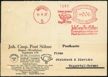 10698 | 18 € | 5800 HAGEN : HAGEN (WESTF.)/ 5/ FABRIK-MARKEN/ Gegr.1758/ Joh.Casp.Post Söhne/ Eisengiessereien.. 1937 (14.8.) AFS Francotyp "Bogenrechteck" (Posthorn-Logo) motivgl. Firmenkt. (links Reg.-Locung geschl.), dekorativ! (Dü.E-1Ah) | ![]() | |