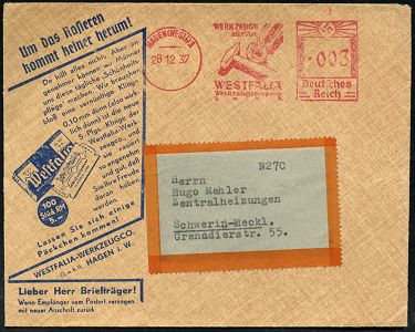10703 | 25 € | 5800 HAGEN : HAGEN (WESTF)1/ ..WESTFALIA/ Werkzeugcompany/ GmbH 1937 (28.12.) AFS Francotyp "Hakenkreuz", (Motive: = Hammer u. Beißzange) , Reklame-Bf.: Westfalia-Rasierklingen mit Text u. Abb., schöne Motive! (Dü.E-1Ao) | ![]() | |