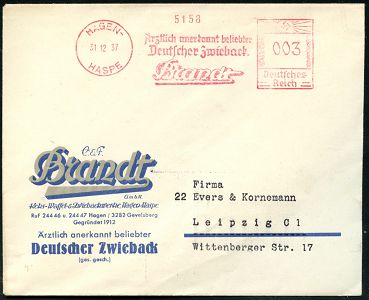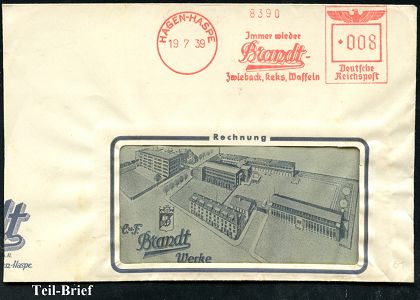 10707 | 18 € | 5800 HAGEN : HAGEN-HASPE/ Jmmer wieder/ Brandt-/ Zwieback,Keks,Waffeln 1939 (19.7.) AFS Francotyp "Reichsadler" klar auf Reklame-Teil-Bf.mit Werks-Abb. (links verkürzt), dekorativ! (Dü.E-5DGh) | ![]() | |