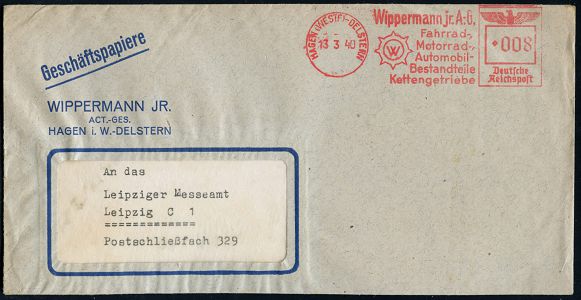 10716 | 18 € | 5800 HAGEN : HAGEN (WESTF)-DELSTERN/ Wippermann jr.A.-G./ Fahrrad-/ Motorrad-/ ..Kettengetriebe 1940 (27.11.) AFS Francotyp "Reichsadler" = Zackenkranz-Logo , klar gest. Firmenbrief, vergl. Kat.-Nr. 10720 (Dü.E-5DG) | ![]() | |