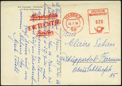 10739 | 16 € | 5800 HAGEN : 58 HAGEN 3/ Mineralöle/ F.W.TUCHT JR./ Reifen 1966 (22.7.) Firmen-AFS 020 Pf. Postalia auf privat geschriebener Bedarfs-Ak. = unzulässige Fremdnutzung eines Firmenfreistemplers , seltene Verwendung! (Dü.E-26B) | ![]() | |
