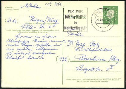10664 | 20 € | 5800 HAGEN : (21b) HAGEN/ a/ 13.9.1959/ TAG der HEIMAT/ im/ Weltflüchtlingsjahr 1959 (29.8.) seltener Serien-MaWSt auf Inl.-P 10 Pf. Heuss III, Bedarf (Bo.S 945 A, nur 16 Tage verwendet!) | ![]() | |