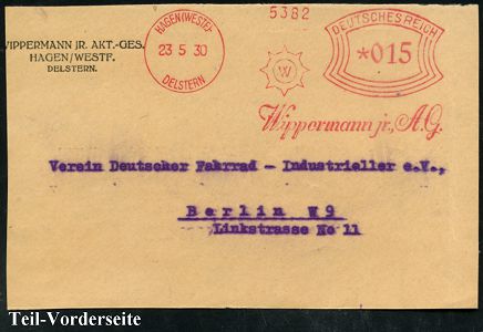 10673 | 15 € | 5800 HAGEN : HAGEN (WESTF.)-/ DELSTERN/ Wippermann jr.A.G. 1930 (23.5.) AFS Francotyp "Bogenrechteck" (Zahnrad-Loo) klar gest. Teil-Vorderseite (Dü.E-1Ah) | ![]() | |