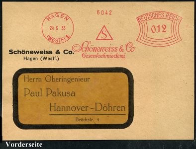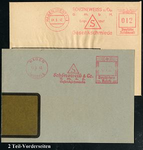 10677 | 30 € | 5800 HAGEN : HAGEN/ (WESTF.) 1/ S/ Schöneweiss & Co/ Gesenkschmiederei 1933/42 3 verschiedene AFS Francotyp "Bogenrechteck", "Hakenkreuz" und "Reichsadler" (je Monogr.-Firmenlogo) je klar auf Firmen-Vorderseite bzw. Teil-Vorderseite, 3 Belege (Dü.E-1CEh, E-3CEo, E-5CGo) | ![]() ![]() | |
