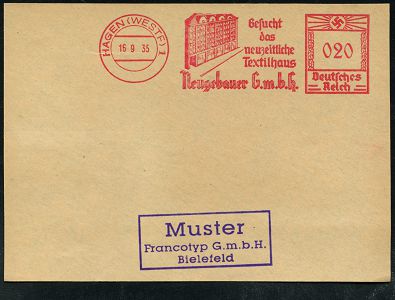 10682 | 35 € | 5800 HAGEN : HAGEN (WESTF) 1/ Besucht/ das/ neuzeitliche/ Textilhaus/ Neugebauer GmbH 1935 (16.9.) AFS-Musterabdruck Francotyp "Hakenkreuz" (Gebäude) glasklar gest. Francotyp-Musterblatt vom (Vor)-Ersttag !, selten! (Dü.E-3CEo) | ![]() ![]() | |