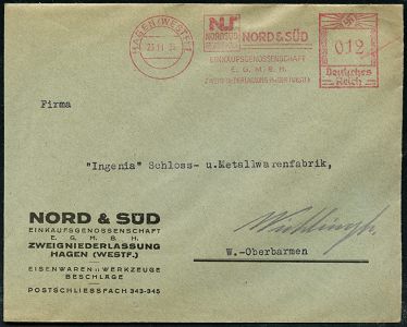 10692 | 20 € | 5800 HAGEN : HAGEN (WESTF) 1/ NS/ NORDSÜD/ GROSSEINKAUF/ NORD & SÜD/ EINKAUFSGENOSSENSCHAFT.. 1936 (23.11.) seltener AFS Francotyp "Hakenkreuz" (Monogr.-Logo) Vordruck-Bf.: NORD & SÜD EINKAUSFGENOSSENSCHAFT,, EISENWAREN - WERKZEUGE, BESCHLÄGE.. (Dü.E-3CEo) | ![]() | |