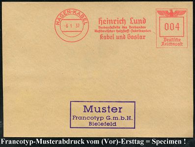10693 | 35 € | 5800 HAGEN : HAGEN-KABEL/ Heinrich Lund/ Verkaufsstelle../ Westdeutscher Holzstoff-Fabrikanten/ Kabel u.Goslar 1937 (6.1.) AFS-Musterabdruck Francotyp "Reichsadler" , glasklar gest. Francotyp-Musterblatt vom (Vor)-Ersttag !, selten! (Dü.E-5CGo) | ![]() ![]() | |