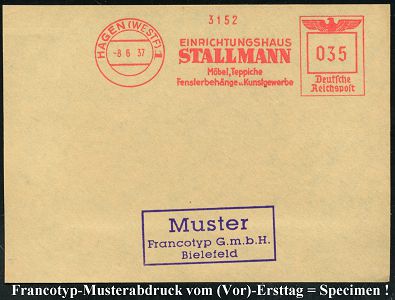 10696 | 35 € | 5800 HAGEN : HAGEN (WESTF) 1/ EINRICHTUNGSHAUS/ STALLMANN/ Möbel,Teppiche/ Fensterbehänge u.Kunstgewerbe 1937 (8.6.) AFS-Musterabdruck Francotyp "Reichsadler" , glasklar gest. Francotyp-Musterblatt vom (Vor)-Ersttag !, selten! (Dü.E-5CGh) | ![]() ![]() | |