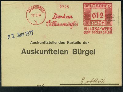 10697 | 14 € | 5800 HAGEN : HAGEN (WESTF.)/ 1/ Denk an/ Villosamintjes/ VILLOSA-WERK/ GEBR.BECKER GMBH 1937 (22.6.) AFS Francotyp "Mäanderrechteck" , klar gest. Firmen-Teil-Vorderseite (Dü.E-2BAh) | ![]() | |