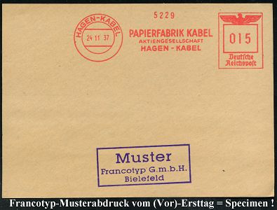 10702 | 35 € | 5800 HAGEN : HAGEN-KABEL/ PAPIERFABRIK KABEL/ AG.. 1937 (24.11.) AFS-Musterabdruck Francotyp "Reichsadler" , glasklar gest. Francotyp-Musterblatt vom (vor)-Ersttag !, selten! (Dü.E-5CGo) | ![]() ![]() | |