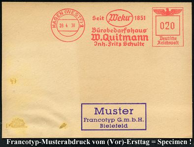 10706 | 25 € | 5800 HAGEN : HAGEN (WESTF) 1/ Seite 1851 "Weku"/ Bürobedarfshaus/ W.Quitmann/ Jnh.Fritz Schulte 1938 (28.4.) AFS-Musterabdruck Francotyp "Reichsadler" (Firmen-Logo) glasklar gest. Francotyp-Musterblatt vom (Vor)-Ersttag ! (3x kl. Fleck), selten! (Dü.E-5CGo) | ![]() ![]() | |
