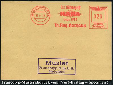 10708 | 35 € | 5800 HAGEN : HAGEN (WESTF) 1/ ..NAHA/ Gegr.1875/ Th.Aug.Harhaus 1938 (12.9.) AFS-Musterabdruck Francotyp "Reichsadler" (Firmen-Logo) glasklar gest. Francotyp-Musterblatt vom (Vor)-Ersttag !, selten! (Dü.E-5CGo) | ![]() ![]() | |