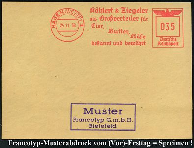10709 | 35 € | 5800 HAGEN : HAGEN (WESTF) 1/ Kählert & Ziegeler/ ...Eier,/ Butter,/ Käse/ bekannt u.bewährt 1938 (24.11.) AFS-Musterabdruck Francotyp "Reichsadler" , glasklar gest. Francotyp-Musterblatt vom (Vor)-Ersttag !, selten! (Dü.E-5CGo) | ![]() ![]() | |