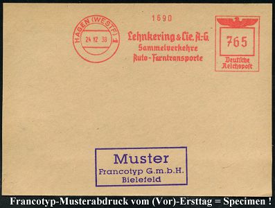 10710 | 35 € | 5800 HAGEN : HAGEN (WESTF) 1/ Lehnkering & Cie. A.G./ Sammelverkehre/ Auto-Ferntransporte 1938 (24.12.) AFS-Musterabdruck Francotyp "Reichsadler" , glasklar gest. Francotyp-Musterblatt vom (Vor)-Ersttag !, selten! (Dü.E-5CGo) | ![]() ![]() | |