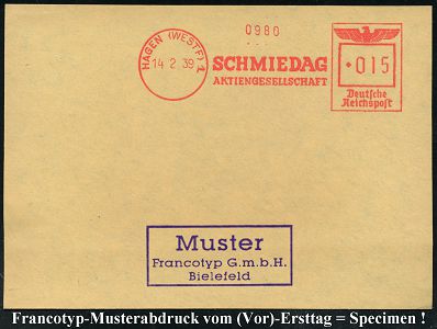 10711 | 35 € | 5800 HAGEN : HAGEN (WESTF) 1/ SCHMIEDAG/ AG 1939 (14.2.) AFS-Musterabdruck Francotyp "Reichsadler" , glasklar gest. Francotyp-Musterblatt vom (Vor)-Ersttag !, selten! (Dü.E-5DGh) | ![]() ![]() | |