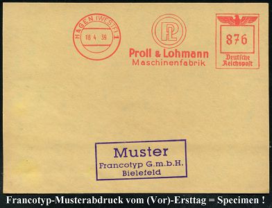 10714 | 35 € | 5800 HAGEN : HAGEN (WESTF) 1/ PL/ Proll & Lohmann/ Maschinenfabrik 1939 (18.4.) AFS-Musterabdruck Francotyp "Reichsadler" (Monogr.-Logo) glasklar gest. Francotyp-Musterblatt vom (Vor)-Ersttag !, selten! (Dü.E-5CGo) | ![]() ![]() | |