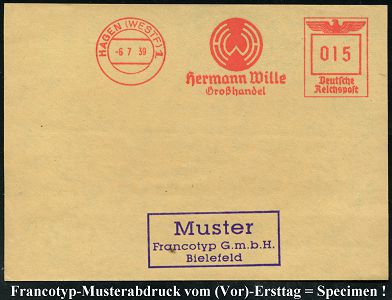 10715 | 35 € | 5800 HAGEN : HAGEN (WESTF) 1/ HW/ Hermann Wille/ Großhandel 1939 (6.7.) AFS-Musterabdruck Francotyp "Reichsadler" (Monogr.-Logo) glasklar gest. Francotyp-Musterblatt vom (Vor)-Ersttag !, selten! (Dü.E-5CGo) | ![]() ![]() | |