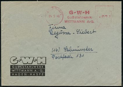 10723 | 25 € | 5800 HAGEN : HAGEN-HASPE/ G-W-H/ Gußstahlwerk/ WITTMANN AG 1946 (24.5.) aptierter AFS Francotyp "Reichsadler" = entfernt = Notmaßnahme! (Monogr.-Logo) motivgl. Firmen-Fern-Bf. (Dü.E-13 AK-147o) | ![]() | |