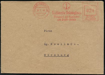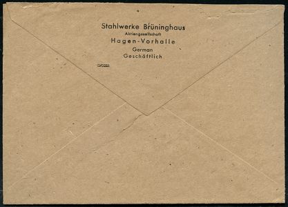 10725 | 20 € | 5800 HAGEN : HAGEN-VORHALLE/ Stahlwerke Brüninghaus/ Walzwerk für Qualitäts-/ u.Profil-Stähle 1946 (31.7.) aptierter AFS Francotyp "Reichsadler" = entfernt = Notmaßnahme! , rs. Abs.-Vordruck (rs. Öffnungsmäng. geschl.) Fern-Bf. (Dü.E-13 J-129o) | ![]() ![]() | |