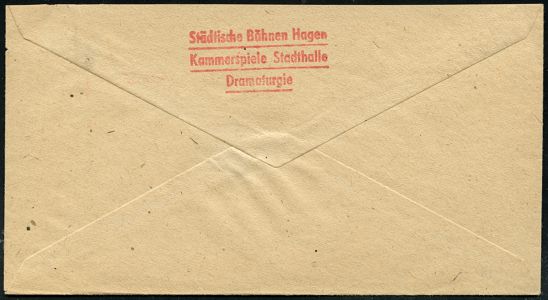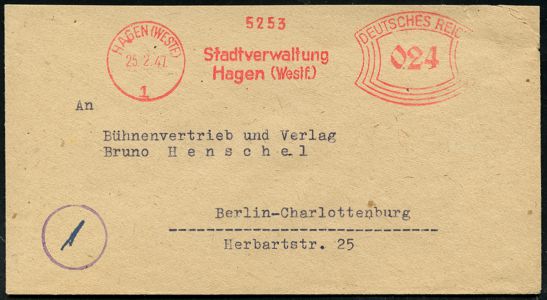 10728 | 25 € | 5800 HAGEN : HAGEN (WESTF.)/ 1/ Stadtverwaltung.. 1947 (25.2.) AFS Francotyp "Bogenrechteck" u n v e r ä n d e r t weiterverwendet mit Inschrift "DEUTSCHES REICH" = Notmaßnahme! , rs. roter Abs.-3L: Städtische Bühnen Hagen, Kammerspiel.., kleiner Fern-Bf. n. West-Berlin (Dü.E-1BAh, unverändert!) | ![]() ![]() | |