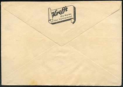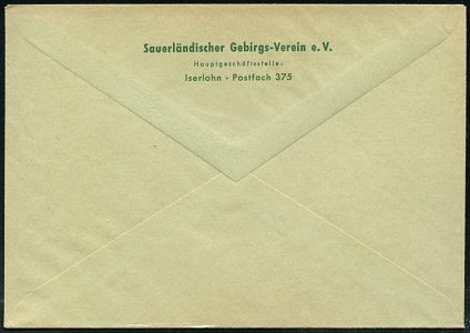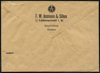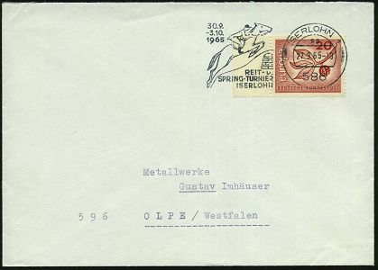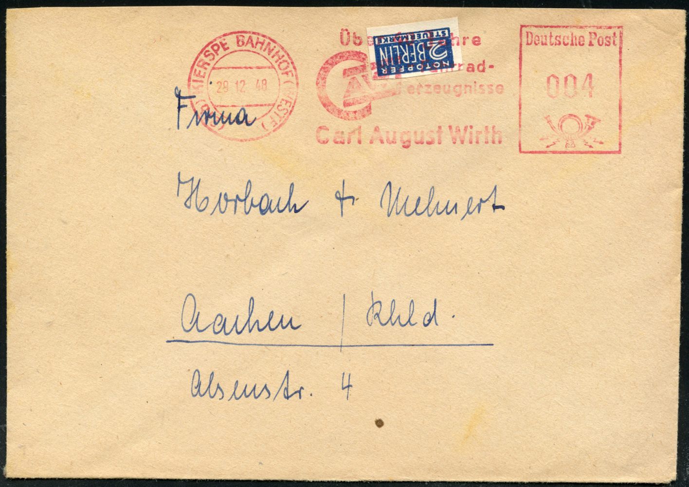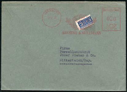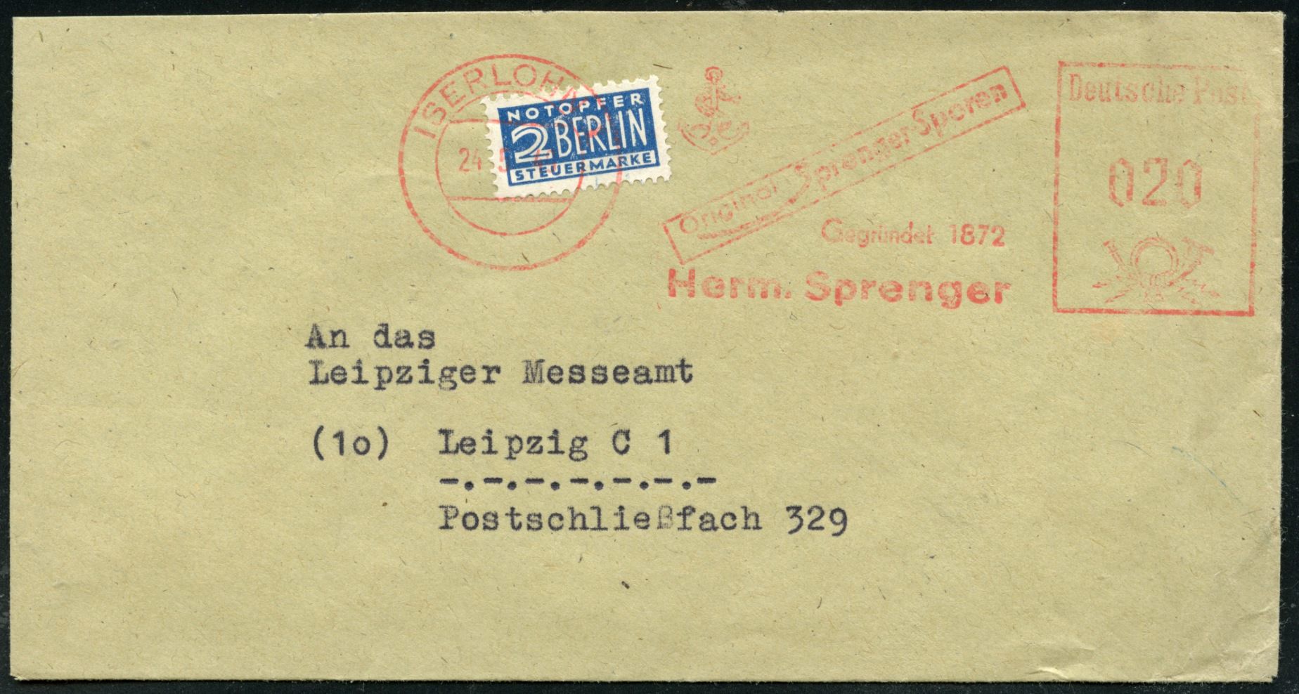 10836 | 35 € | PL-Raum 58 : ISERLOHN 1/ Original Sprenger Sporen/ Gegr.1872/ Herm.Sprenger 1949 (24.5.) AFS Francotyp "Posthorn" 020 Pf. irrtümlich auf 2 Pf. NoB (= Vorausentwertung) auf eigentlich notopfer-befreitem Firmen-Bf. in die SBZ an die Messe, Leipzig, dort unbeanstadet, obwohl die 2 Pf. NoB zur Unterstützung von W e s t - Berlin diente, seltener Beleg! (Dü.E-20CG) | ![]() | |