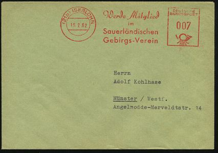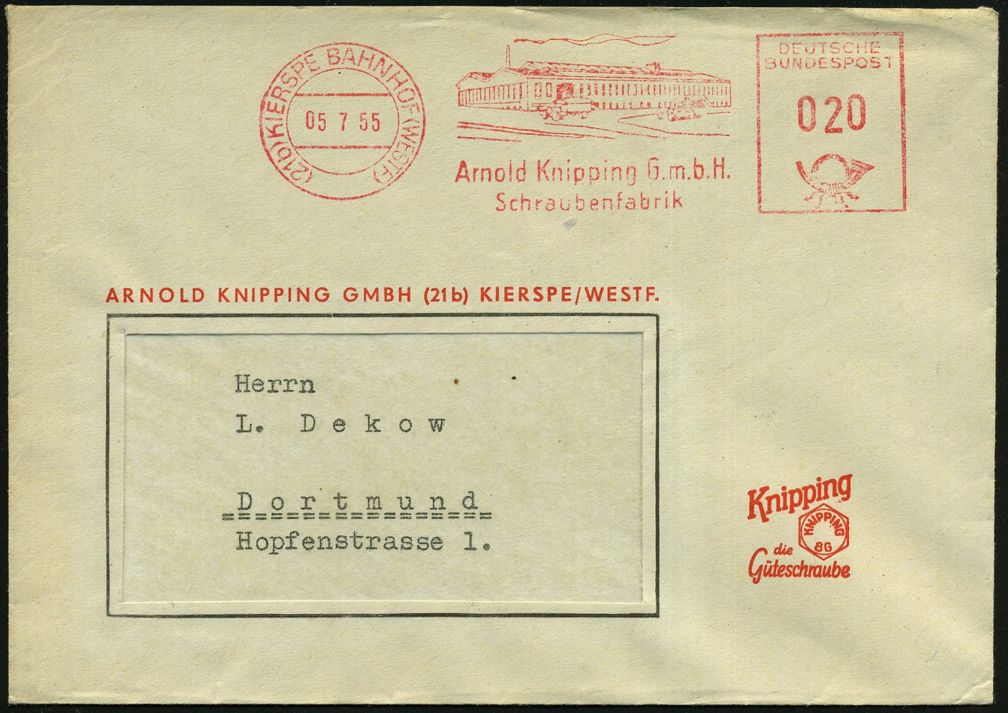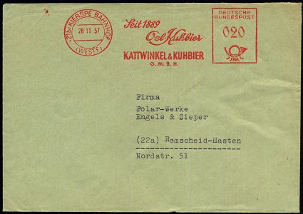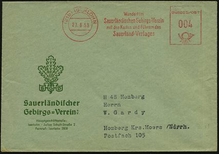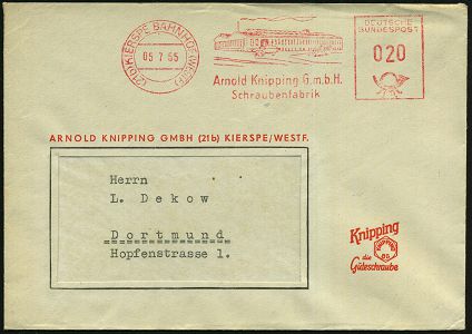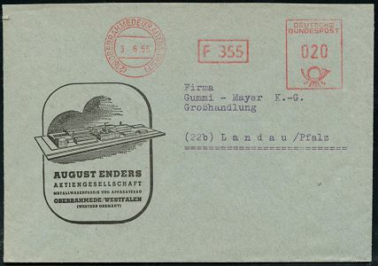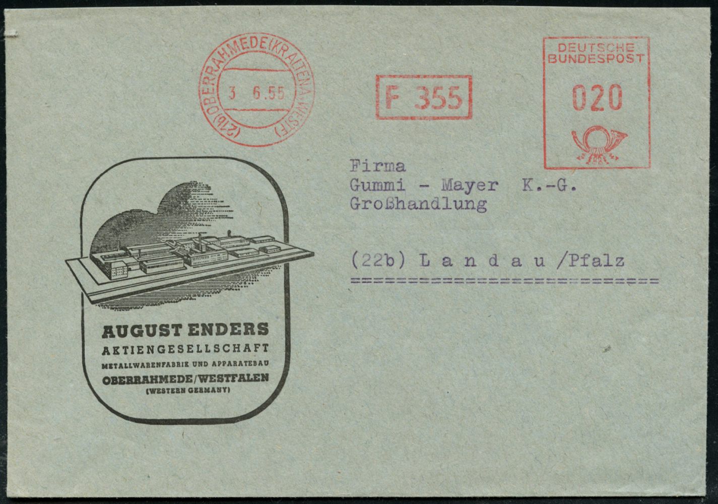 10915 | 18 € | PL-Raum 58 : (21b) OBERRAHMEDE (KR ALTENA,WESTF)/ F 355 1955 (3.6.) Probe-AFS Francotyp "Posthorn" mit Nummern-Klischee , nur 4 Wochen möglich! (danach musste die Firma die Maschine übernehmen und ein Abs.-Klischee beantragen) dekorativer Reklame-Bf.: AUGUST ENDERS AG, Metallwarenfabrik... mit Fabrik-Anlagen, seltener Beleg! (Dü.E-23CO) | ![]() | |