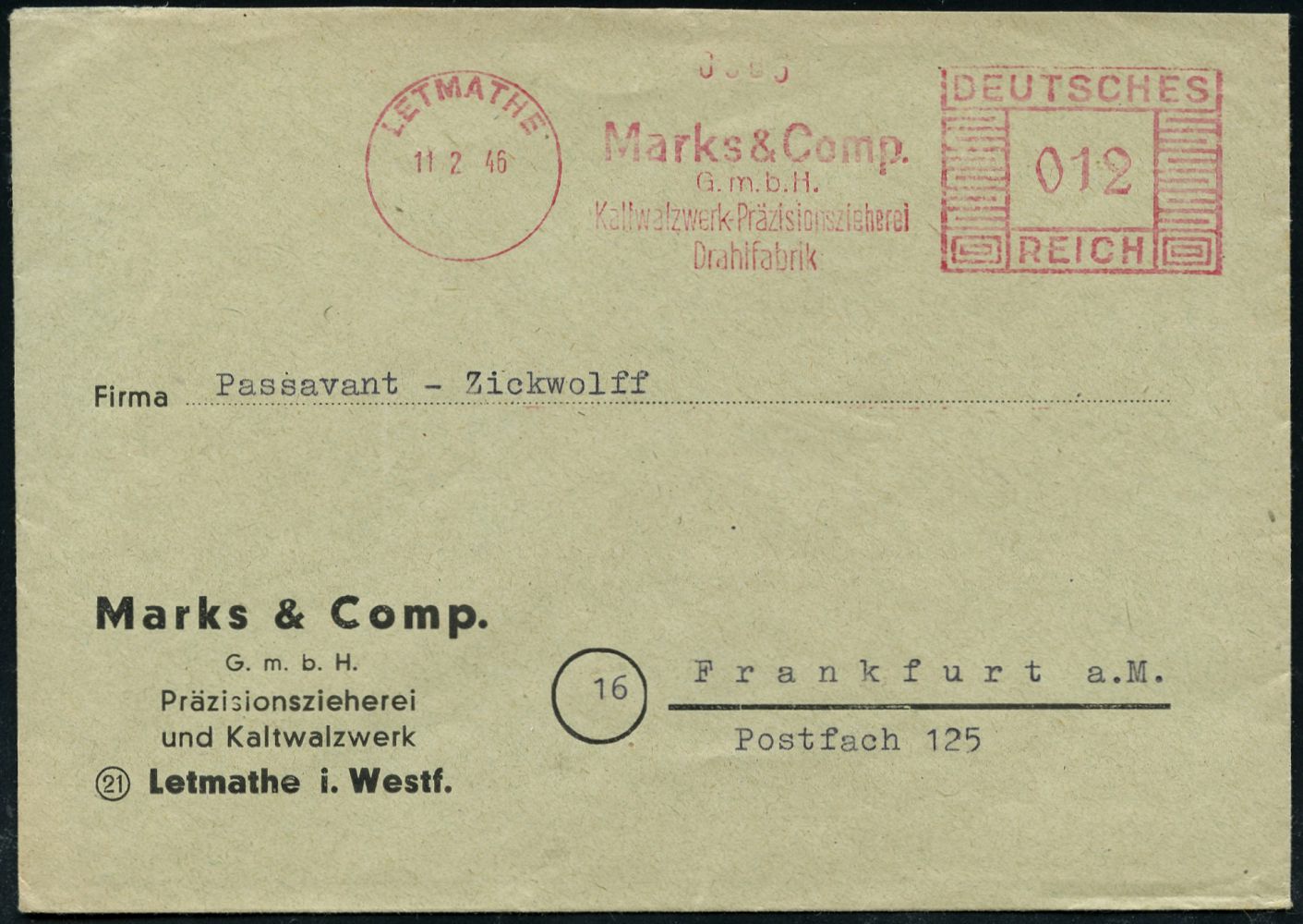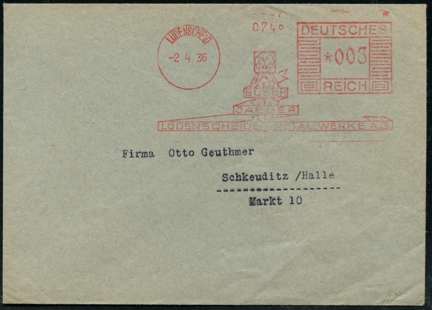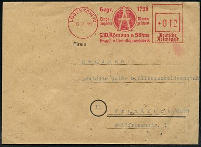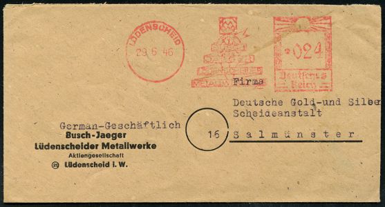 10880 | 35 € | PL-Raum 58 : LÜDENSCHEID/ BUSCH/ JAEGER/ LÜDENSCHEIDER/ METALLWERKE AG 1946 (29.6.) seltener, aptierter AFS Francotyp "Hakenkreuz" = entfernt = Notmaßnahme! (Firmen-Logo) kleiner Firmen-Fern-Bf. an Degussa, vergl. Kat.-Nr. 10874 (Dü.E-12 D-86o = seltene Type!) | ![]() | |