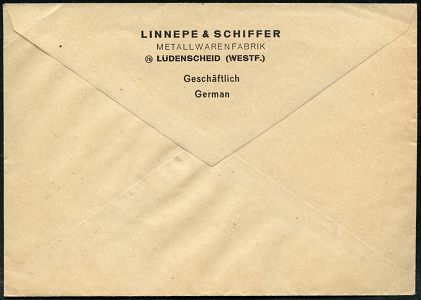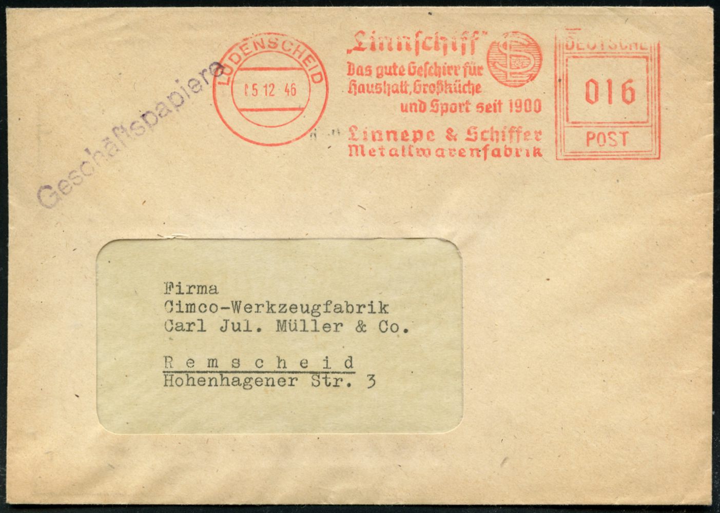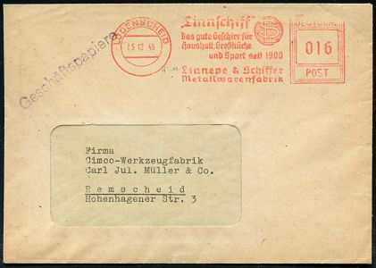 10883 | 20 € | PL-Raum 58 : LÜDENSCHEID/ "Linnschiff"/ Das gute Geschirr für/ Haushalt,Großküche/ u.Sport.. 1946 (15.12.) seltener AFS Francotyp "Hochrechteck" 016 (Pf.) (Monogr.-Logo) rs. Abs.-Vordruck, Fern-Bf. "Geschäftspapiere" (Dü.E-18CGo) | ![]() ![]() | |