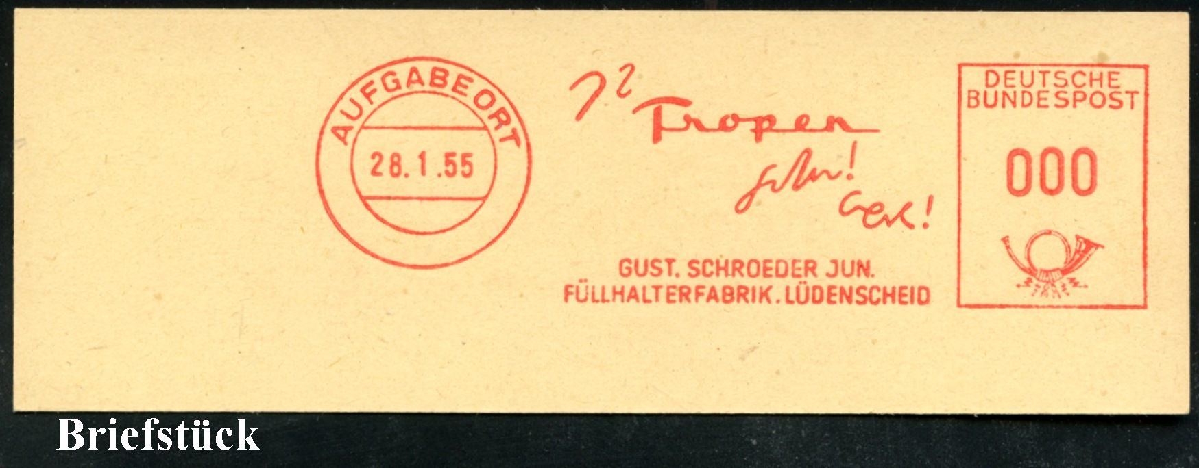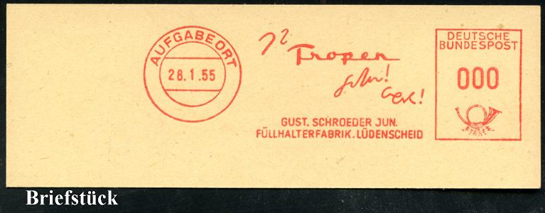 10889 | 25 € | PL-Raum 58 : Lüdenscheid 1955 (28.1.) Muster-AFS in 000: AUFGABEORT/..GUST.SCHROEDER JUN./FÜLLHALTERFABRIK = Musterabdruck, teils in S t e n o ! , glasklar gest. Muster-Briefstück (Francotyp E-23CO) | ![]() | |