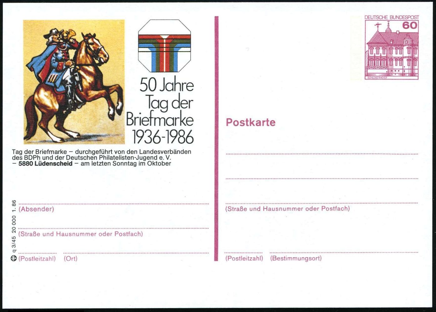 10894 | 8 € | PL-Raum 58 : 5880 Lüdenscheid 1986 60 Pf. BiP "50 Jahre Tag der Briefmarke".. Philat.-Jugend Lüdenscheid (Postreiter mit Posthorn, Logo) ungebr., vergl. Kat.-Nr. 10895-96 (Mi.P 138/q3-48) | ![]() | |