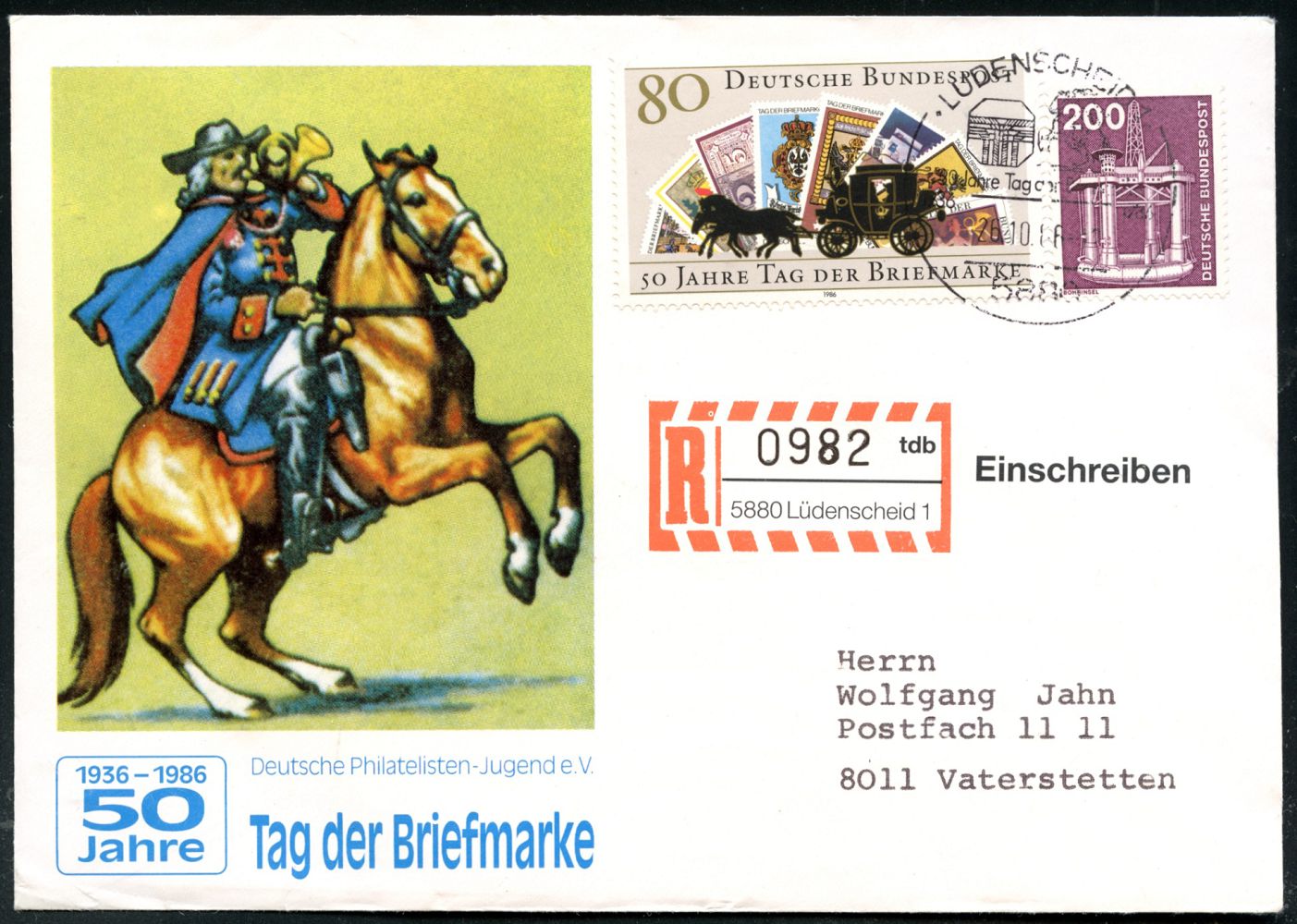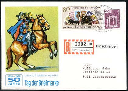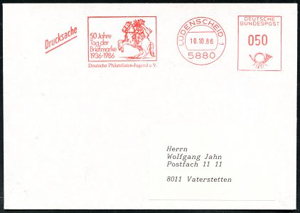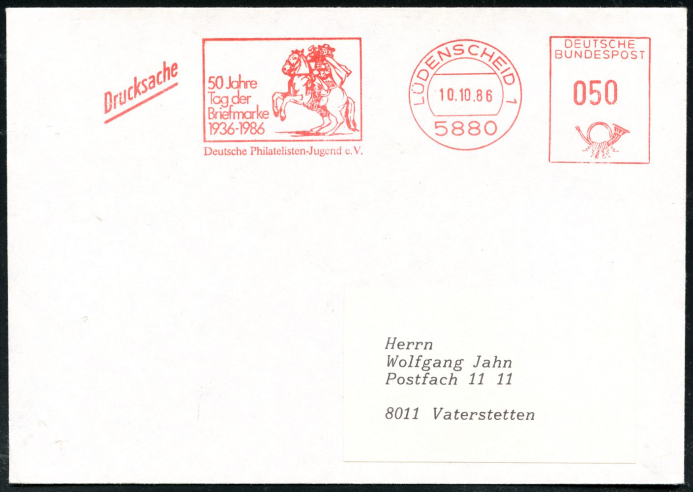 10895 | 10 € | PL-Raum 58 : 5880 LÜDENSCHEID 1/ 50 Jahre/ Tag d./ Briefmarke.. 1986 (10.10.) AFS Francotyp (Postreiter mit PosthHorn) klar gest. Inl.-Bf. (Dü.E-26) | ![]() | |