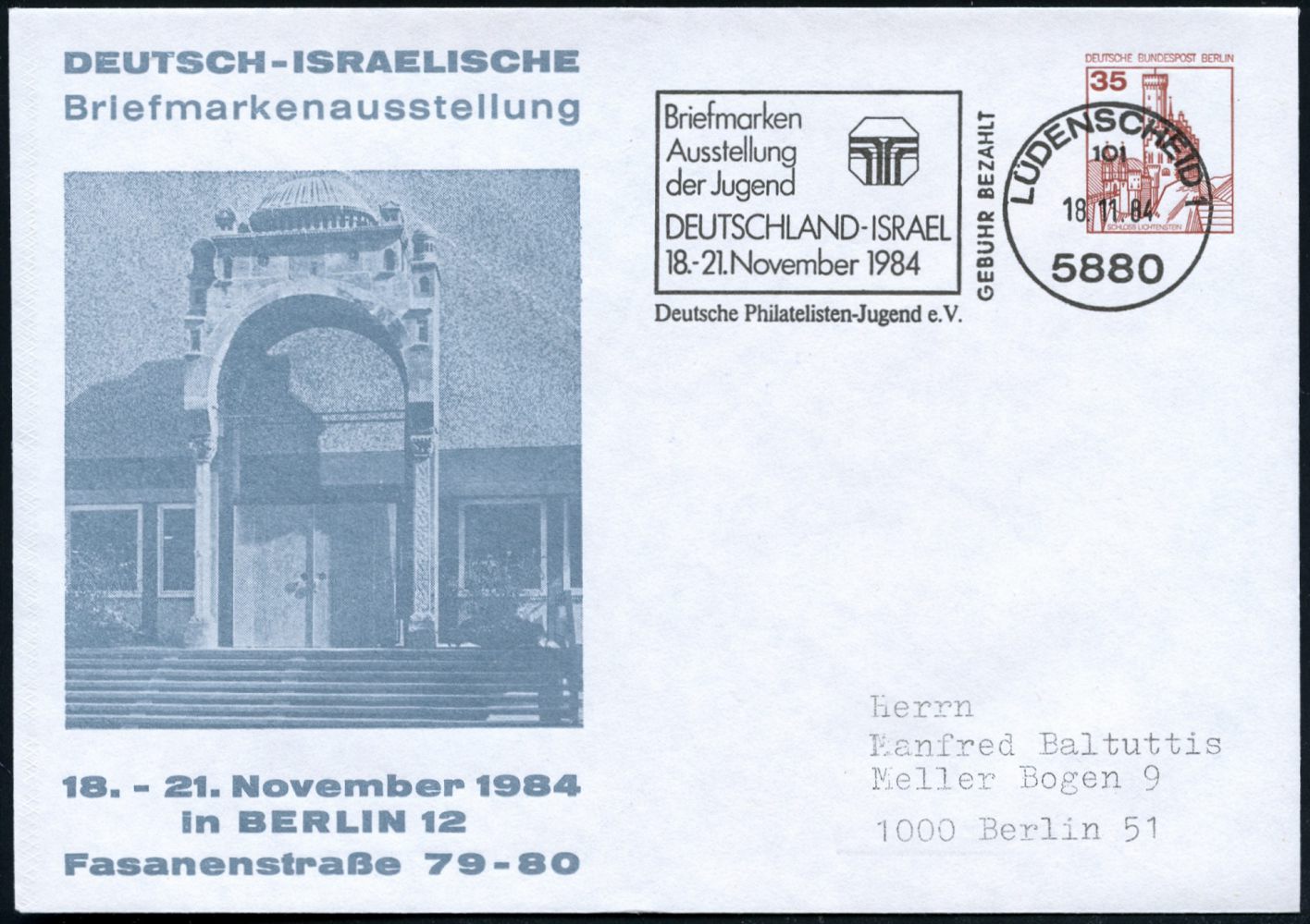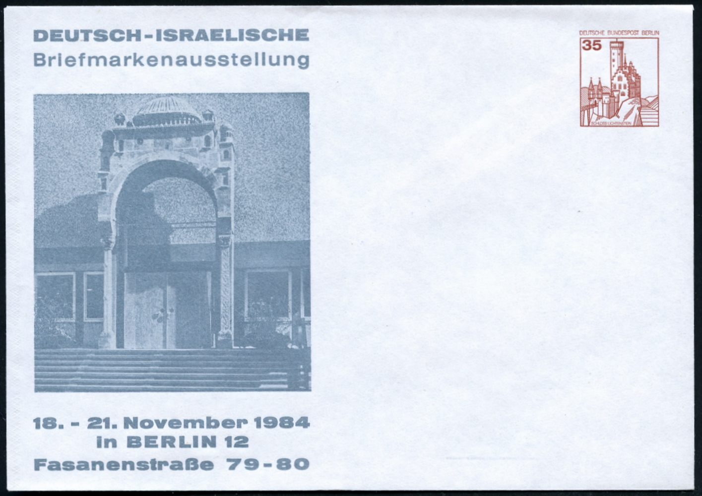 10893 | 16 € | PL-Raum 58 : Lüdenscheid / Berlin 1984 (Nov.) PU 35 Pf. Burgen, braun: Deutsch-Israel. Briefmarken-Ausstellung = altes Portal der Synagoge Fasanenstraße , je ungebr. bzw. mit passender Vorausentwertung: 5880 LÜDENSCHEID 1/101/GEBÜHR BEZAHLT.. (= Vorausentwertung) Einzelverkauf möglich: ungebr. 8.- EUR, mit VE gebr.: 11.- EUR) 2 Belege (Mi.PU 124/5) | ![]() ![]() | |