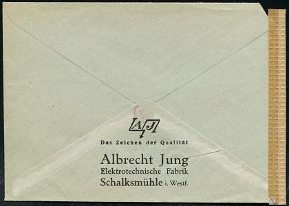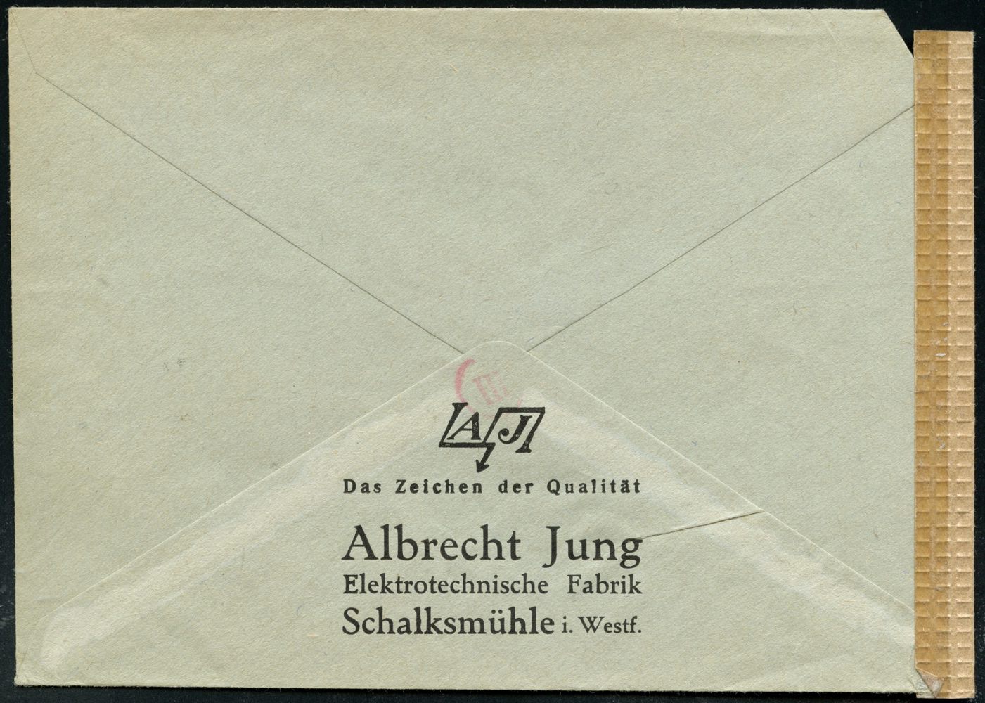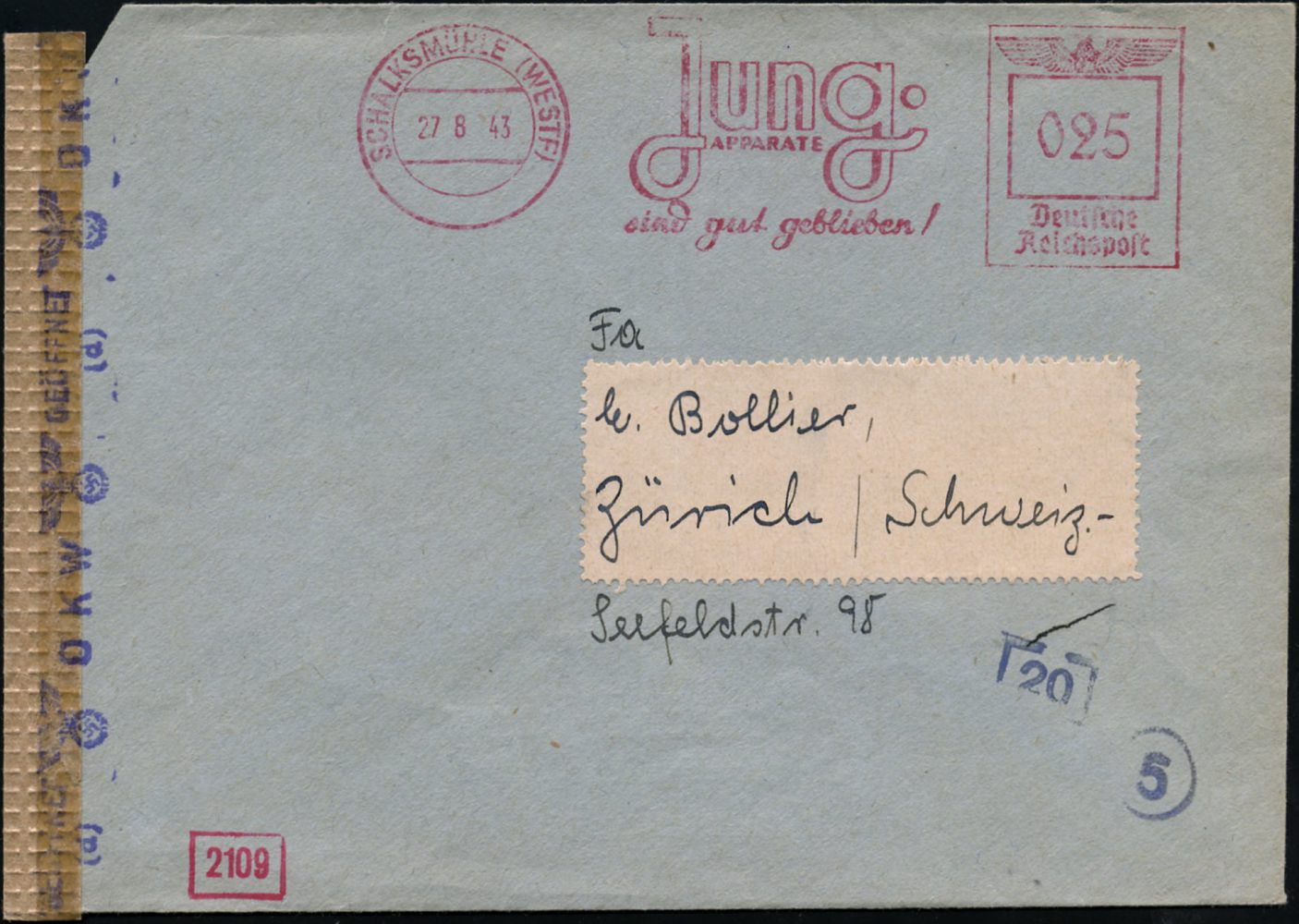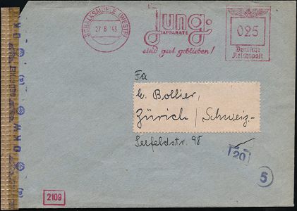 10920 | 28 € | PL-Raum 58 : SCHALKSMÜHLE (WESTF)/ Jung/ APPARATE/ sind gut geblieben! 1943 (27.8.) AFS Francotyp "Reichsadler" 025 Pf. + viol. OKW-Zensur-Band-MaSt.: GEÖFFNET/O K W/(d) = München (Rie.D-21 viol. selten!) + neutaler Streifen (Bf. oben Ecke schräg geschn.) rs. Abs.-Vordruck: Albrecht Jung/ Elektrotechn. Apparate, Ausl.-Zensur-Bf. n. Zürich (Dü.E-5CEo) | ![]() ![]() | |