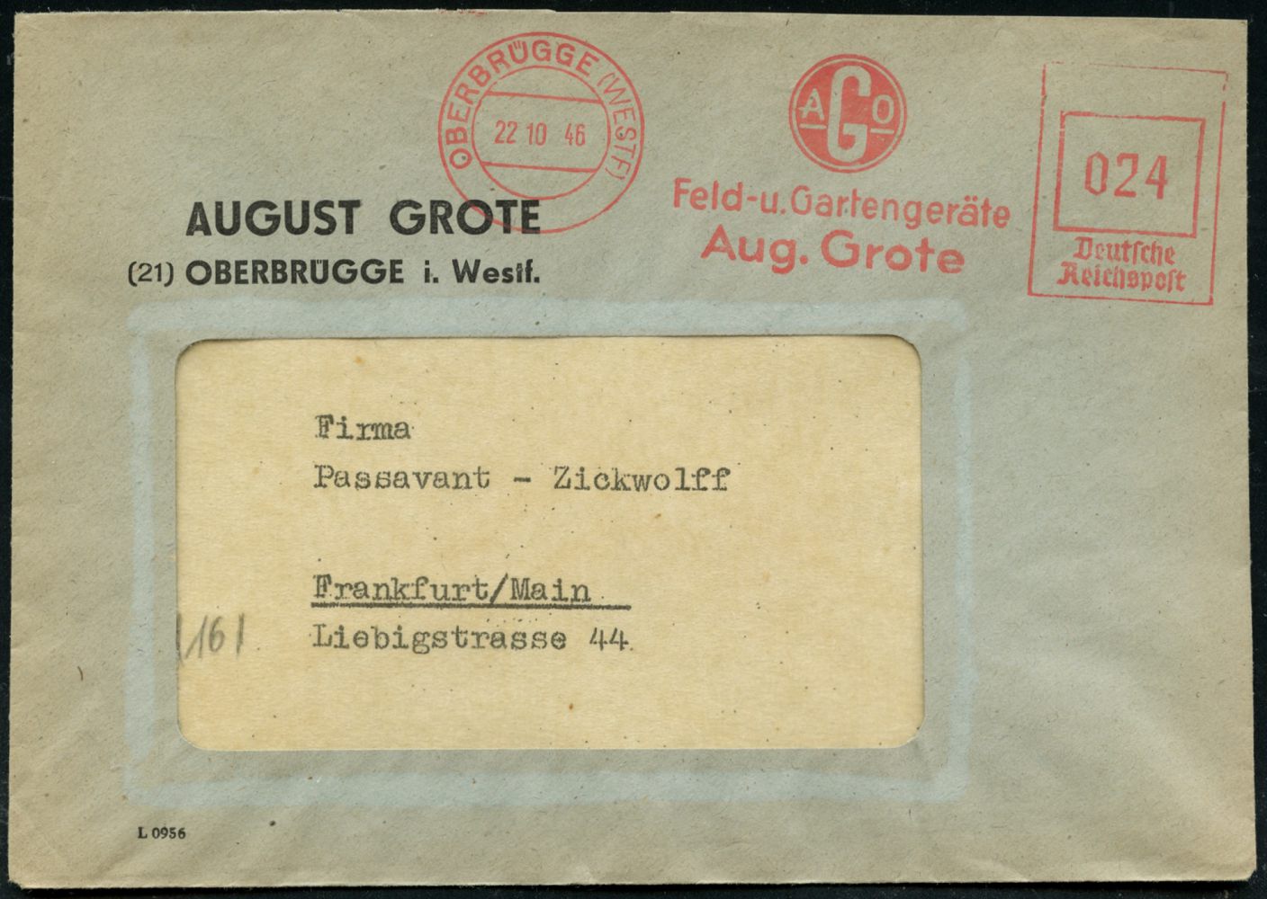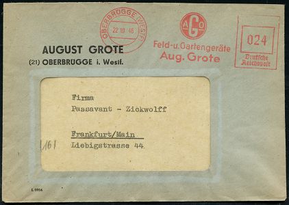 10908 | 22 € | PL-Raum 58 : OBERBRÜGGE (WESTF)/ AGO/ Feld-u.Gartengeräte/ Aug.Grote 1946 (22.10.) aptierter AFS Francotyp "Reichsadler" = entfernt = Notmaßnahme! (Monogr.-Logo) klar gest.Firmen-Fern-Bf. (Dü.E-13A-109o) | ![]() | |