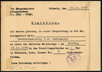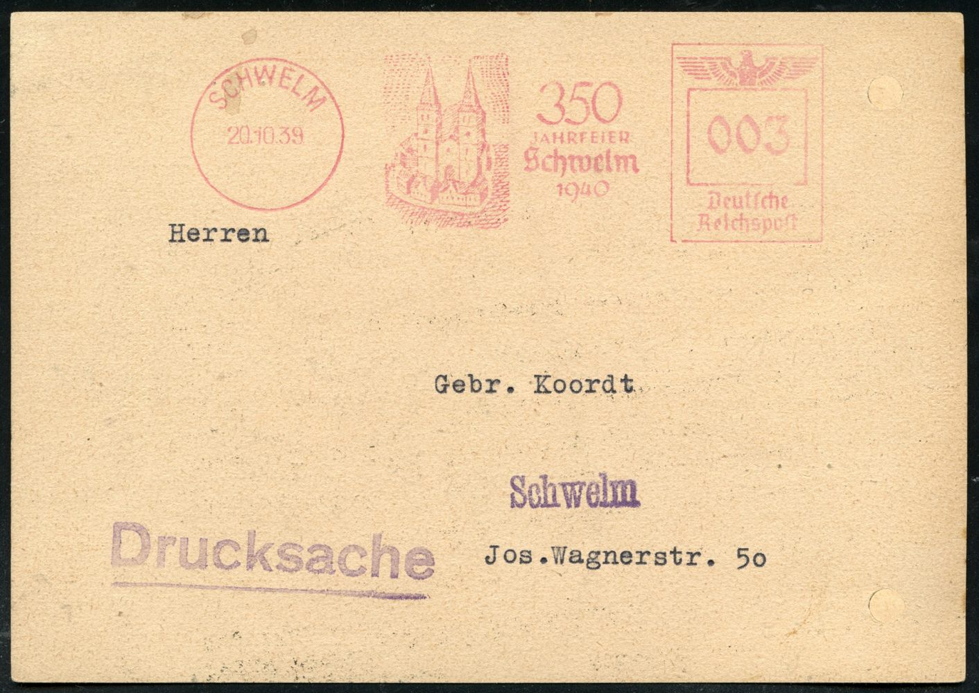 10931 | 20 € | PL-Raum 58 : SCHWELM/ 350 JAHRFEIER/ Schwelm/ 1940 1939 (20.10.) Jubil-AFS Francotyp "Reichsadler" (Christuskirche) Kommunal-Kt. (Reg.-Lochung geschl.) rs. interess. Text über eine "Hundeanmeldung für die Wehrmacht" (Beschlagnahme eines Hundes für die Wehrmacht ?), seltene Dienstsache (Dü.E-5BA) | ![]() ![]() | |