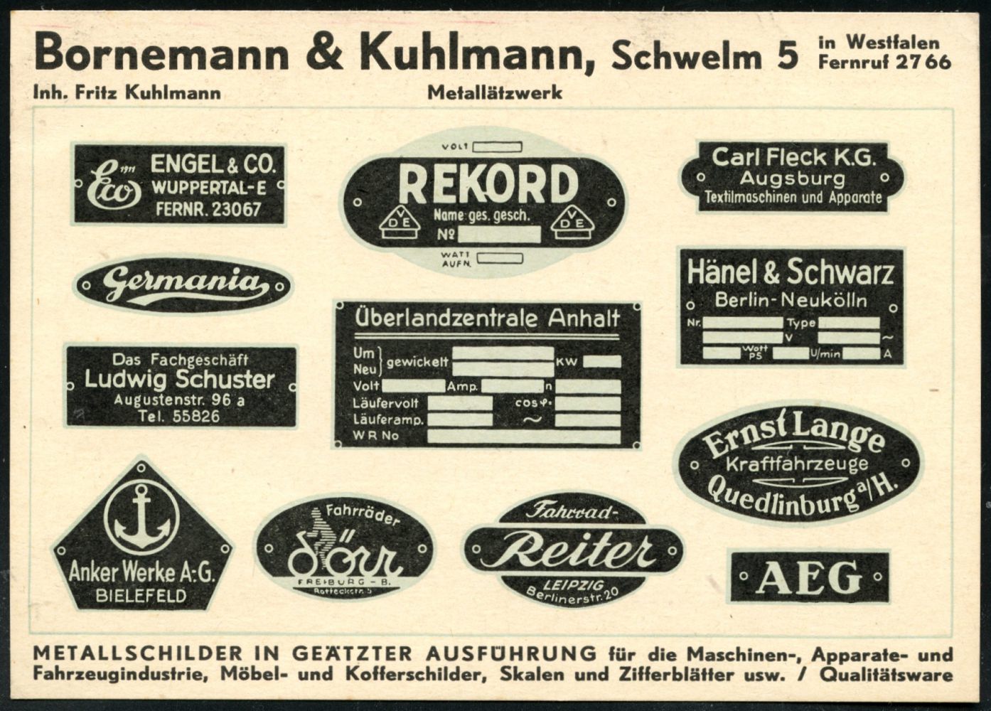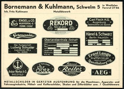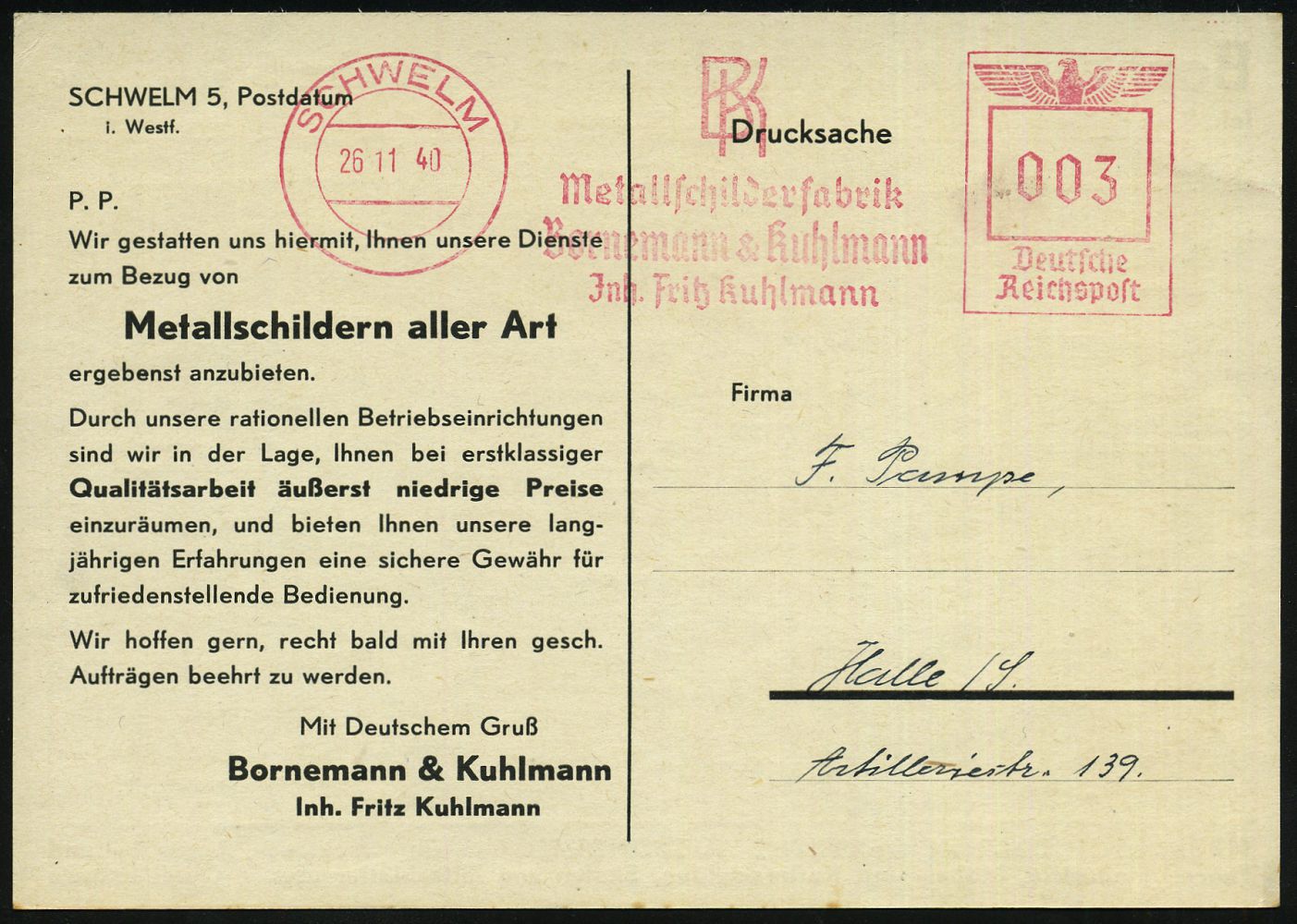 10932 | 25 € | PL-Raum 58 : SCHWELM/ BK/ metallschilderfabrik/ Bornemann & Kuhlmann/ Jnh.Fritz Kuhlmann 1940 (26.11.) AFS Francotyp "Reichsadler" (Monogr.-Logo) seltene, zweifarbige Reklame-Kt.: Schilderbeispiele, dabei AEG, Anker-Werke, Dörr-Farräder etc. (Dü.E-5CGo) | ![]() ![]() | |