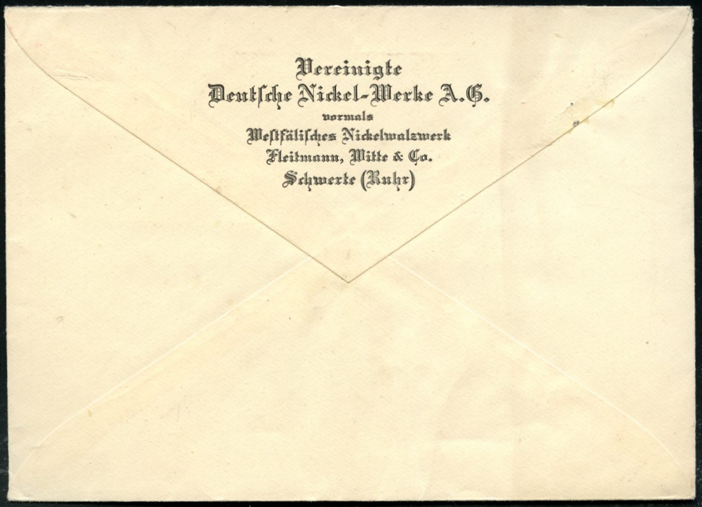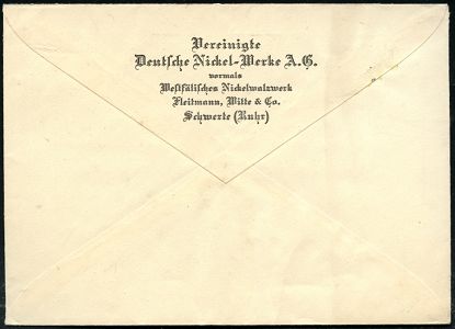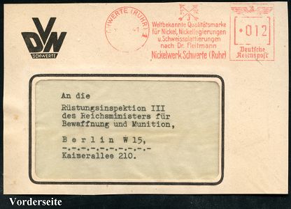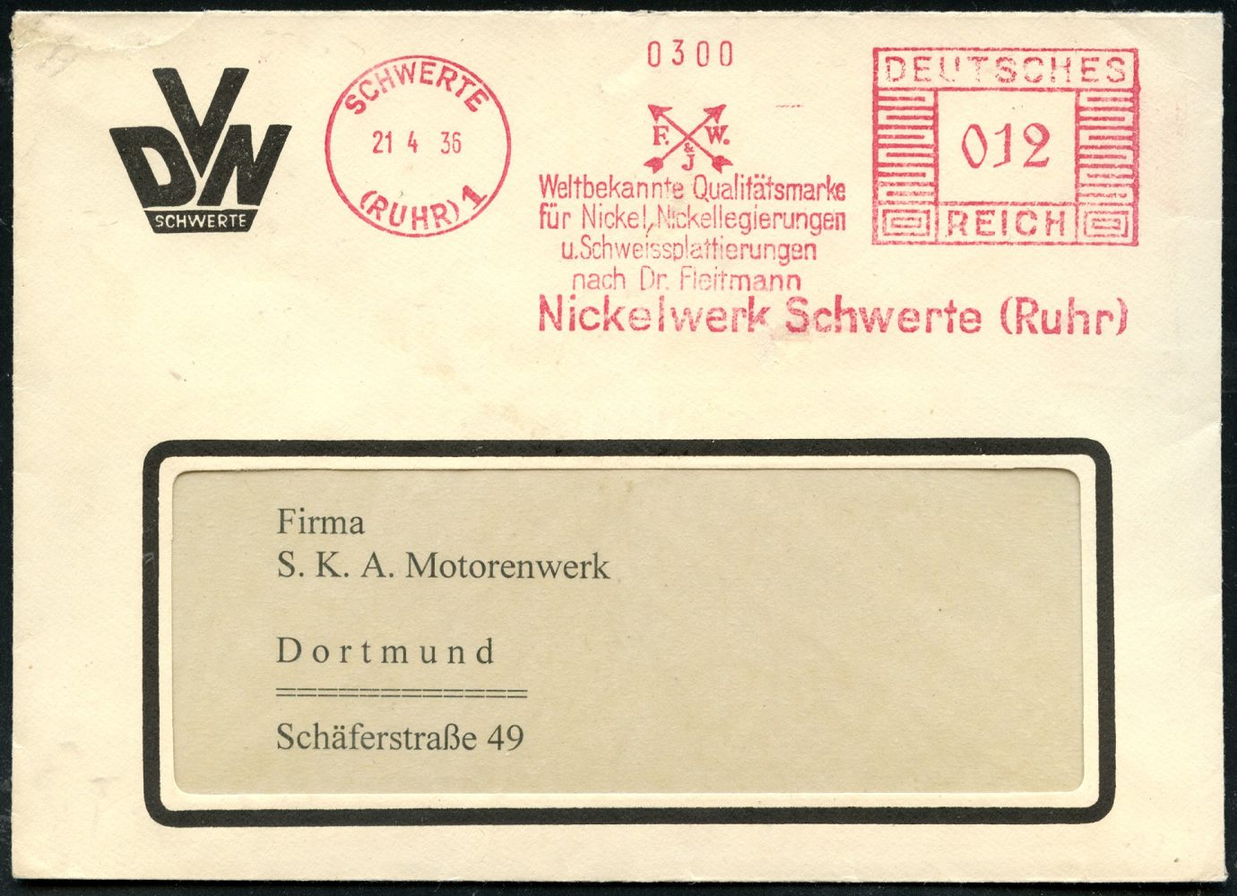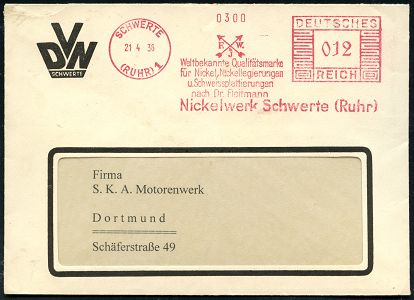 10945 | 20 € | PL-Raum 58 : SCHWERTE/ (RUHR) 1/ F.W.& J./ Weltbekannte Qualitätsmarke/ für Nickel,Nickellegierungen/ u.Schweissplattierungen../ Nickelwerk Schwerte.. 1936 (21.4.) AFS Francotyp "Mäanderrechteck" (Pfeil-Monogr.-Logo) rs. Abs.-Vordruck: Vereinigte Deutsche Nickel-Werke A.G. (links kl. Eckriß geschl.) Fern-Bf. (Dü.E-2CEh) | ![]() ![]() | |