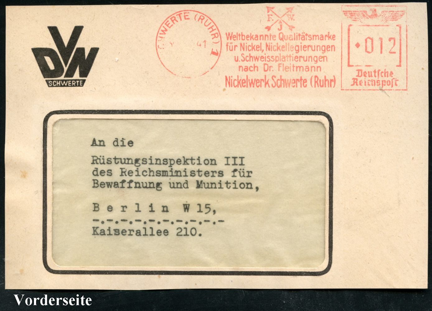 10948 | 16 € | PL-Raum 58 : SCHWERTE/ (RUHR)1/ F.W.&J./ Weltbekannte Qualitätsmarke/ für Nickel,Nickellegierungen/ u.Schweiss-platinen/ nach Dr.Fleitmann.. 1941 AFS Francotyp "Reichsadler" (Pfeil-Monogr.-Logo) Firmen-Vorderseite: VDN = Vereinigte Deutsche Nickelwerke AG. (Dü.E-2) | ![]() | |