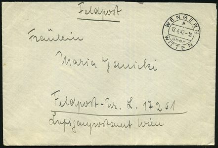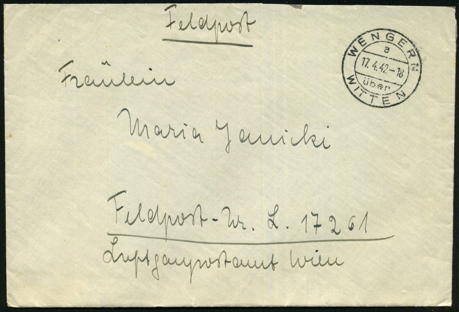 10953 | 15 € | PL-Raum 58 : WENGERN/ a/ über/ WITTEN 1942 (17.4.) 2K-Steg = PSt. I-Typ auf Feldpost-Bf. an Feldpost-Nr. L 17 261 = Luftgau-Kommando Südost, Lgpa Wien + Inhalt!, 2 Belege kompl.! | ![]() ![]() | |
