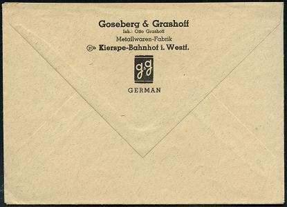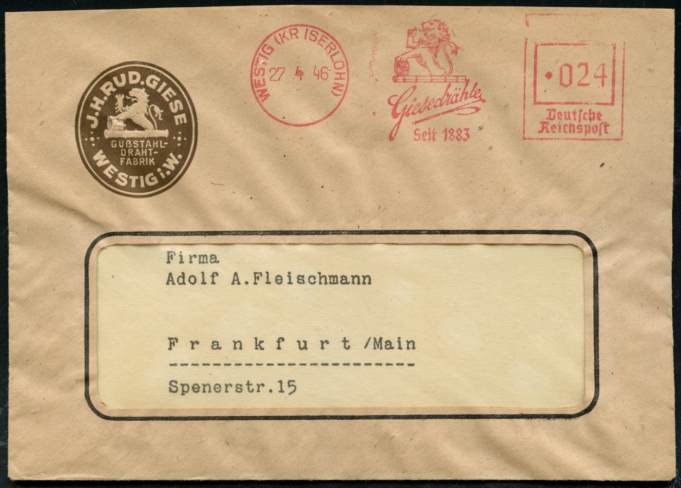 10955 | 25 € | PL-Raum 58 : WESTIG (KR ISERLOHN)/ Giesedrähte/ Seit 1883 1946 (31.5.) aptierter AFS Francotyp "Reichsadler" = entfernt (Firmen-Logo: Löwe mit Drahtrolle) motivgl. Firmen-Bf.: J. H. RUD. GIESE, GUSSTAHL-DRAHT-FABRIK mit Prägerelief (Dü.E-13 J-147o) | ![]() | |