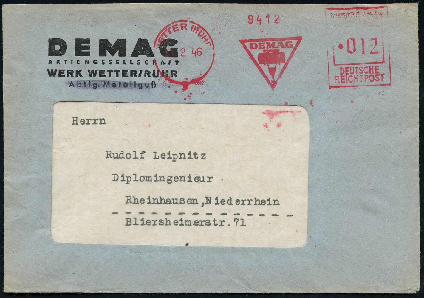 10958 | 25 € | PL-Raum 58 : WETTER (RUHR)/ 1/ DEMAG 1946 (21.2.) seltener, aptierter AFS Francotyp "Reichsadler" Antiqua = entfernt = Notmaßnahme! (Logo mit Kran-Zug) Firmen-Fern-Bf.: DEMAG AG.. = ehem. Rüstungsbetrie (Dü.E-14 C-DGh) | ![]() | |