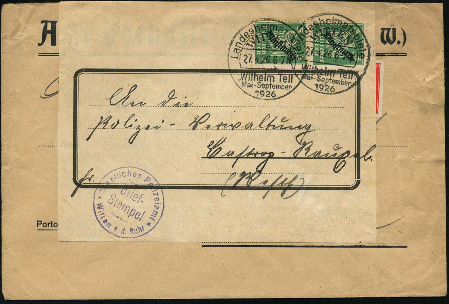 10959 | 35 € | PL-Raum 58 : WITTEN/ a/ Landesheimatspiele/ "Wilhelm Tell"/ Mai-Spetember 1926 (27.4.) HWSt 2x auf Paar 5 Pf. Dienst (Mi.D 106 MeF) + viol. 1K-HdN: Staatliches Polizeiamt.., dekorativer Polizei-Recycling-Dienstbf., doppelt verwende! (rechts unsichtbarer Riß), seltener Beleg! (Bo.1 a) | ![]() | |